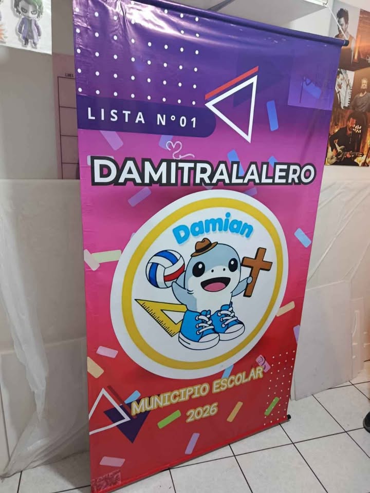 Banner para colegio 180x100cm con tubos de plástico arriba y abajo.